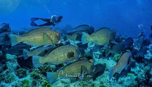 Finding yourself engulfed by a large school of bumphead parrotfish as they nonchalantly munch their way through acres of coral reef, is an experience not easily forgotten.