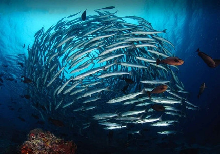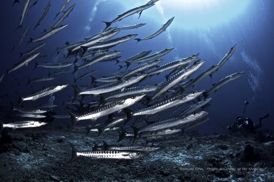 Hunting for food is a serious business for barracudas and thanks to their sharp eyesight and powerful jaws, they are one of a few predators towards the top of the food chain. Known to be extremely opportunistic, they often camouflage near sea grass to ambush unsuspecting prey, and move fast (over 40 km/h) through corals reefs hunting for food. When attacking they do so with a single clean bite of deadly consequence.