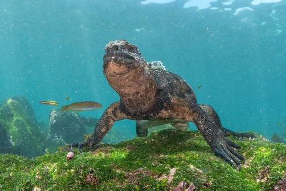 They can grow to more than 1.5m in length and weight up to 13 kg. Marine iguanas are famed for their dining habits, which can include swimming down into the shallows and munching algae off the submerged rocks.