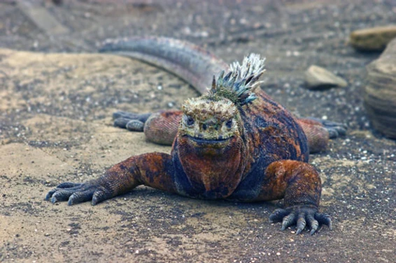 Most commonly, marine iguanas are seen lounging or moving slowly along rocky shorelines exposed to the sun. They normally lie flat on their stomachs, exposing as much of their skin as possible to the sun’s energy-giving rays.