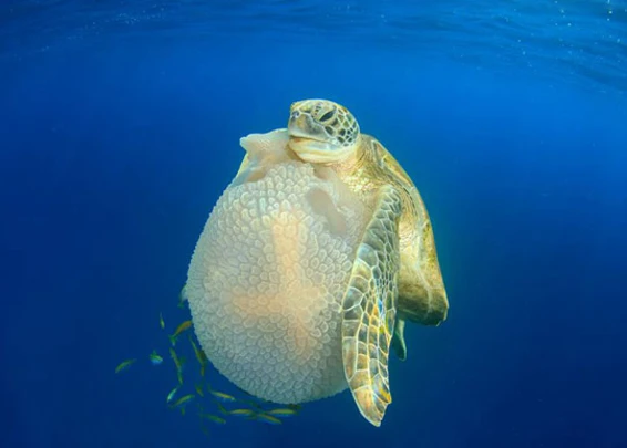 A juvenile turtle hitches a ride on a jellyfish in the Andaman Sea