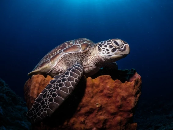Turtle resting on a barrel sponge at Bunaken Island. Photo Courtesy: Bastianos