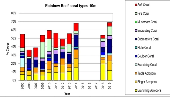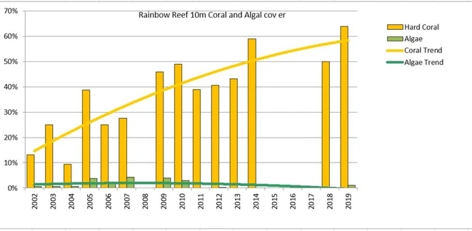 Take a look at the graph to the left. As you can see 2002 and 2004 saw a startling shortage in coral coverage, with hard coral representing just 10%. Since then there has been a rebound effect where hard coral coverage is well and truly back to pre-bleaching levels in Fiji and now as high as 65% by 2019.