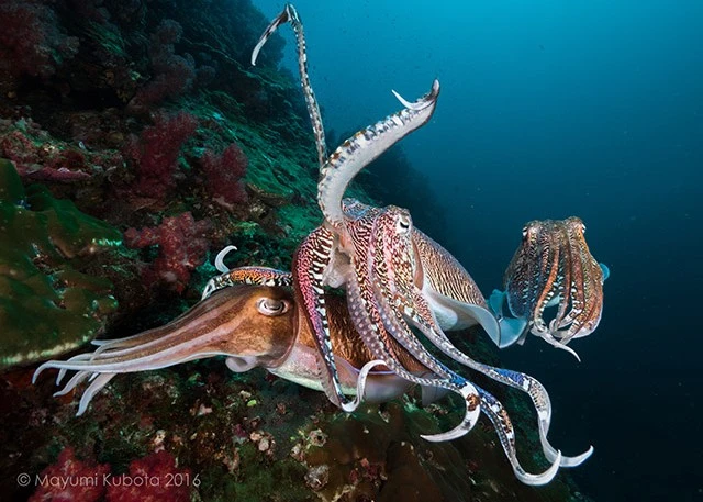 The clear and unpolluted seas around the islands are home to healthy populations of hard and soft corals, starfish, feather stars, lobsters, clams, anemones, crabs, sea pens and a rich diversity of fish including parrotfish, damselfish, triggerfish, lionfish, angelfish, batfish, grouper and reef sharks to name just a few. Whale sharks and whales are occasional visitors to the area.